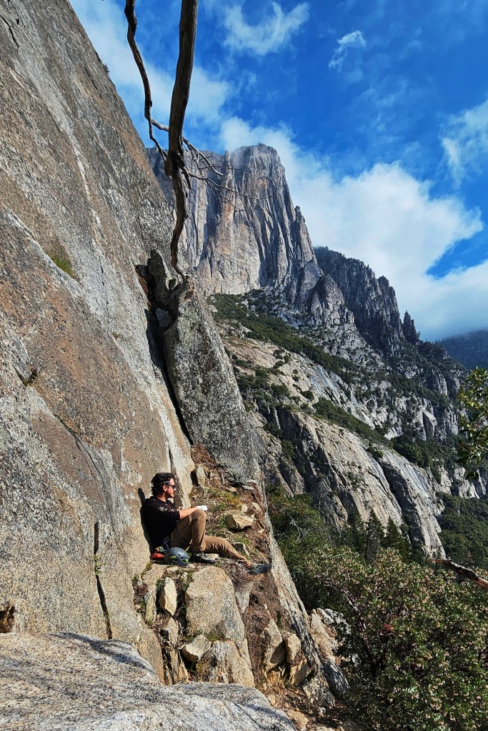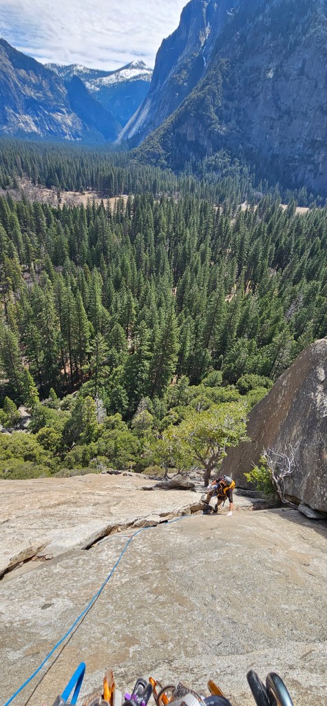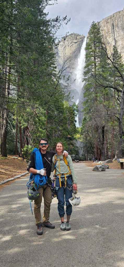 March 28th 2025. I’m at this point 31 years old. Two days from now is my birthday. Sam and I have spent the morning in the parking lot at Yosemite lodge, taking turns using the restroom in the cafeteria and buying breakfast burritos while the other clipped lightly worn cams and slings onto our harnesses.